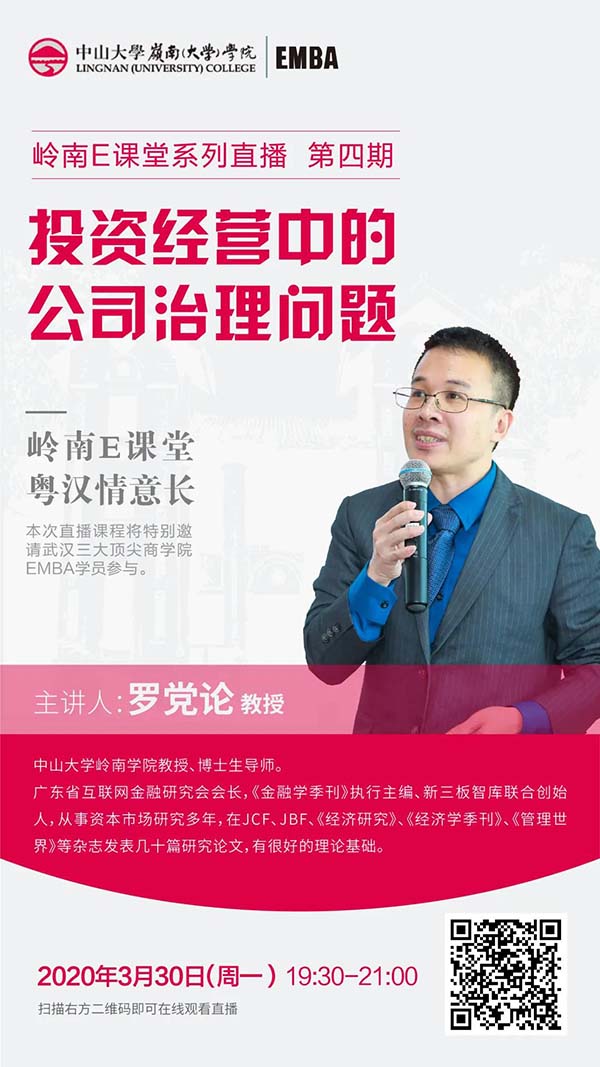 第四期“嶺南E課堂”直播講座將于3月30日重磅上線。屆時EMBA教育中心將邀我院羅黨論教授進行《投資經(jīng)營中的公司治理問題——經(jīng)驗與教訓(xùn)》主題講座,就目前疫情對國家經(jīng)濟影響下公司治理問題進行深度解剖與分析。
