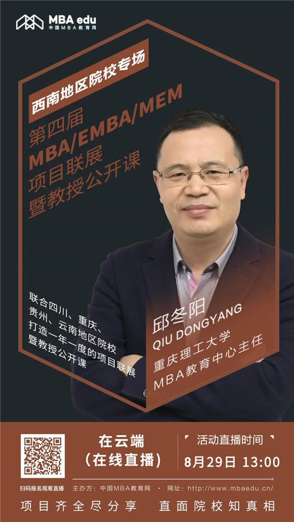 為給2021級(jí)考生提供更加全面、有用的招考信息,中國MBA教育網(wǎng)特別聯(lián)合重慶理工大學(xué)MBA,舉辦第四屆全國MBA項(xiàng)目聯(lián)展暨教授公開課(西南地區(qū)專場),旨在打通院校和考生之間的信息壁壘,搭建院校及考生之間的高效的交流平臺(tái)??忌勺悴怀鰬舯M知重慶理工大學(xué)MBA項(xiàng)目招生政策。