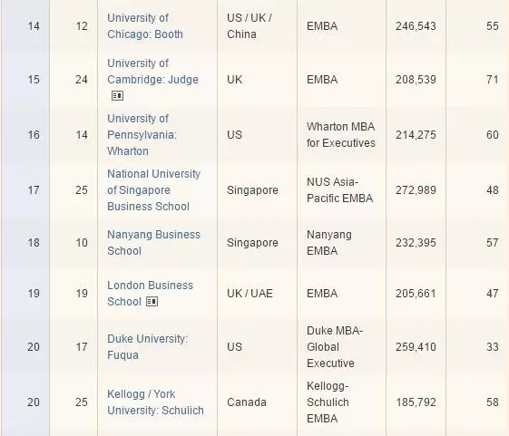 在今年的榜單前列,香港科技大學和凱洛格管理學院合辦的中美EMBA項目重新奪回冠軍寶座,清華大學與英士國際商學院(Insead)合作項目排名第二,華盛頓大學奧林(Olin)商學院與復(fù)旦大學合作項目排名第五。