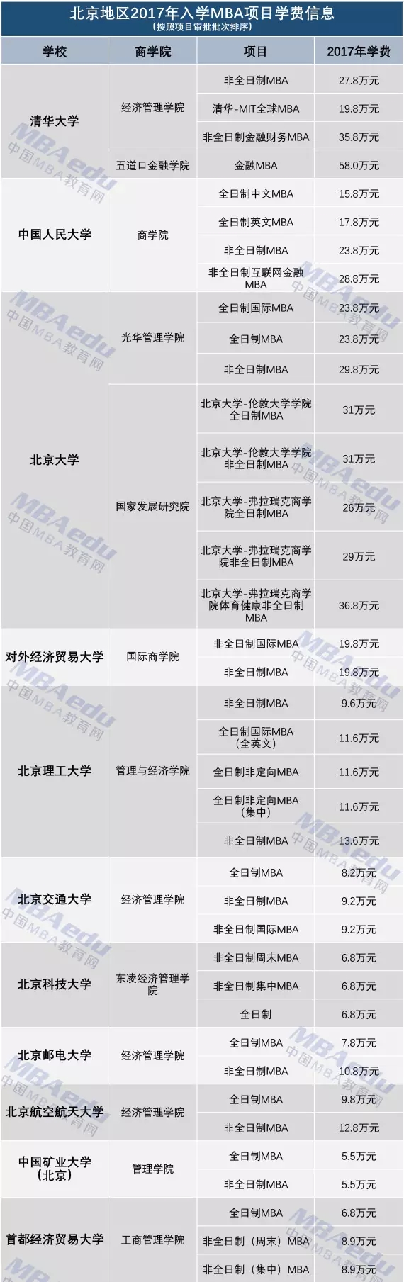 在2016年教育部發(fā)文將碩士研究生嚴格按照培養(yǎng)模式區(qū)分為全日制和非全日制之后,各商學院針對其MBA項目的2017年招生政策進行了更改,以符合國家規(guī)定。小編本次對北京地區(qū)2017年入學MBA項目學費的更新,是依據(jù)院校已經(jīng)公布的招生簡章、手冊、說明等進行搜集整理的,部分項目招生簡章依然對于MBA是全日制還是非全日制沒有進行明確區(qū)分,小編則依照中國研究生招生信息網(wǎng)中的碩士目錄,對其進行了區(qū)分,方便大家查找。