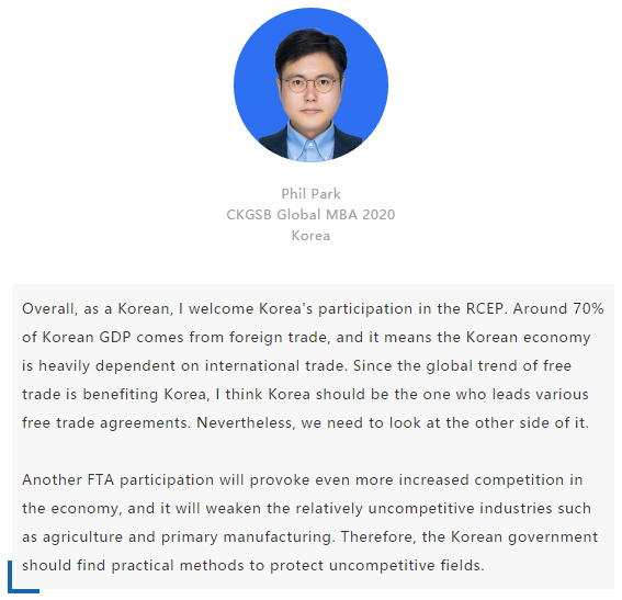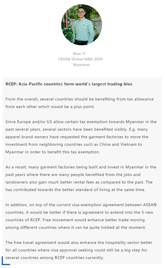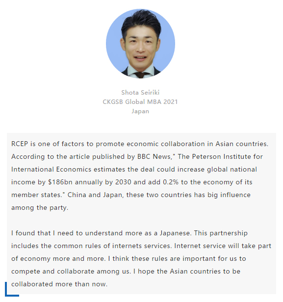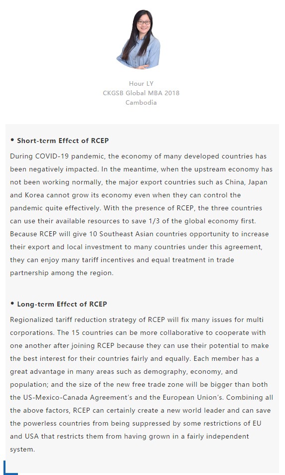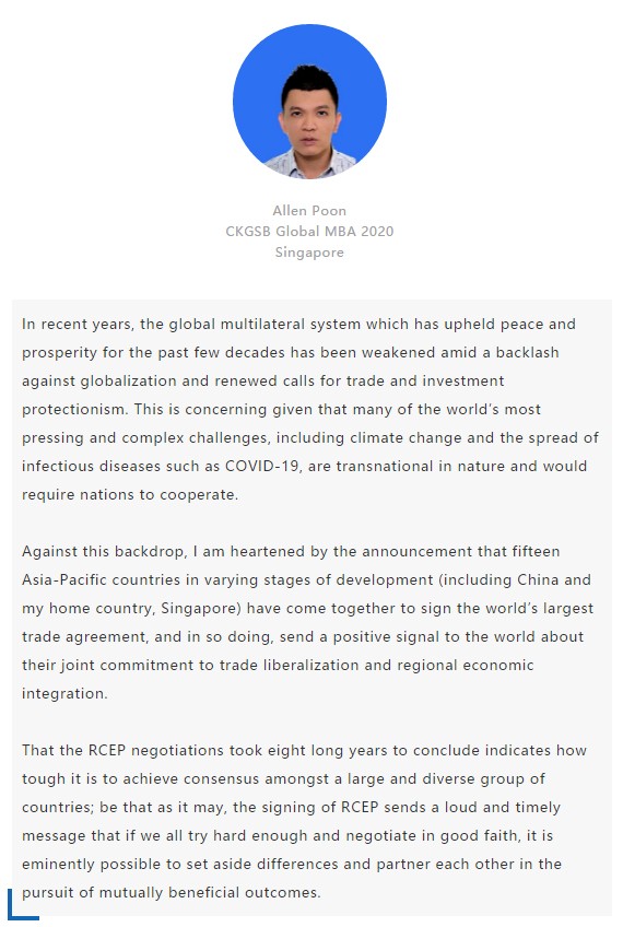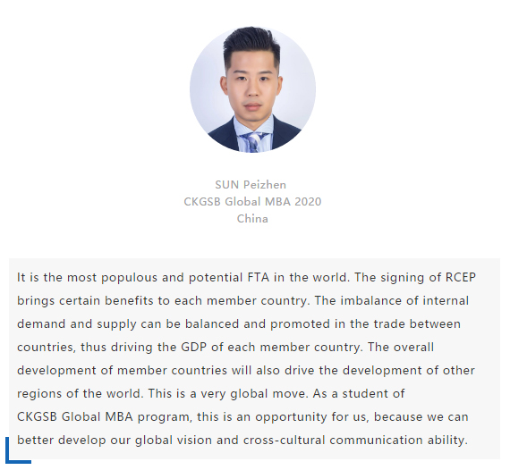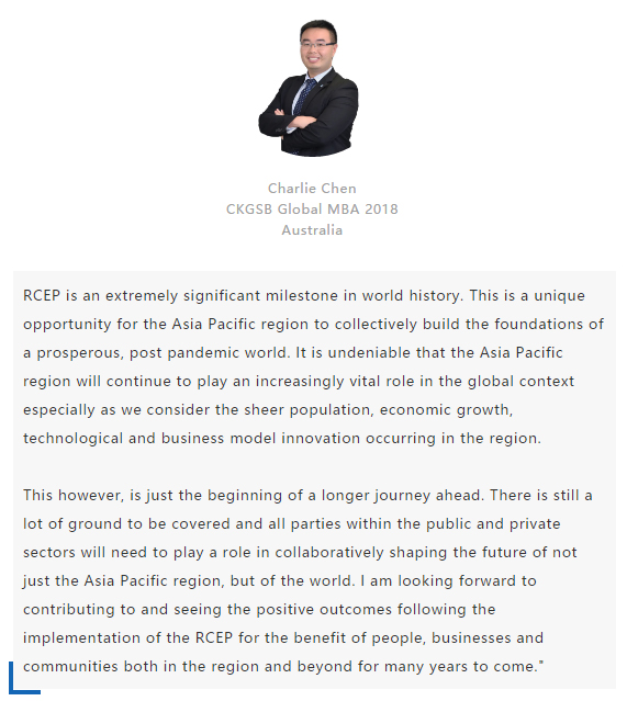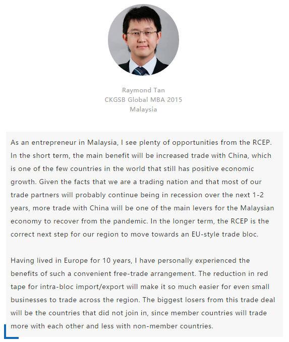 【中國MBA教育網(wǎng)訊】近日,經(jīng)過八年的艱苦談判,中國、日本、韓國、澳大利亞、新西蘭和東盟十國共15國通過視頻簽署《區(qū)域全面經(jīng)濟(jì)伙伴關(guān)系協(xié)定》(RCEP),宣告亞太區(qū)域全面經(jīng)濟(jì)伙伴關(guān)系組織成立。 該區(qū)域組織以消除關(guān)稅和非關(guān)稅貿(mào)易壁壘、促進(jìn)投資便利化和自由化為重要目標(biāo),通過構(gòu)建RCEP,彰顯對自由貿(mào)易和多邊體制的堅(jiān)定支持,在世界經(jīng)濟(jì)形勢復(fù)雜多變的背景下,RCEP致力于共同打造一個(gè)跨區(qū)域的、寬領(lǐng)域、高質(zhì)量的貿(mào)易和投資環(huán)境。 RCEP協(xié)定作為一個(gè)現(xiàn)代、全面、高水平和互惠的協(xié)定,覆蓋人口23億人,占全球人口的30%,成員國GDP總和達(dá)25.6萬億美元,占全球總量的29.3%,區(qū)域內(nèi)貿(mào)易額為10.4萬億美元,占全球總貿(mào)易額的27.4%,是目前全球涵蓋人口最多、經(jīng)濟(jì)總量最大、貿(mào)易額最多的自貿(mào)協(xié)定。 RCEP向投資者發(fā)出一個(gè)重要信號,即該地區(qū)仍決心推進(jìn)多邊貿(mào)易一體化。這一舉措使得區(qū)域內(nèi)商品流通更加順暢。鑒于韓國、日本將大量生產(chǎn)基地設(shè)在東南亞,未來區(qū)域價(jià)值鏈將不斷融合、升級,推動區(qū)域經(jīng)濟(jì)全面創(chuàng)新發(fā)展。 RCEP為全球經(jīng)濟(jì)增長及多邊貿(mào)易一體化帶來利好,同時(shí)也凸顯中國拉動區(qū)域經(jīng)濟(jì)流動、維護(hù)自由貿(mào)易的決心。該協(xié)定與“一帶一路”倡議相結(jié)合,將有助于中國構(gòu)建更加利于相關(guān)項(xiàng)目落地的經(jīng)濟(jì)空間,通過加強(qiáng)交通、能源、通信等領(lǐng)域的互聯(lián)互通,促進(jìn)地區(qū)經(jīng)濟(jì)協(xié)同發(fā)展。 長江商學(xué)院自成立以來,懷抱躋身世界一流商學(xué)院的夢想,一直以“為中國和世界培養(yǎng)一批具有全球視野與全球資源整合能力、人文關(guān)懷與社會擔(dān)當(dāng)以及創(chuàng)新精神的世界級商業(yè)領(lǐng)袖”為己任,為打造全球新一代商學(xué)院做出了一系列探索與創(chuàng)新。 長江商學(xué)院Global MBA項(xiàng)目一直以培養(yǎng)新生代經(jīng)濟(jì)顛覆式商業(yè)領(lǐng)袖為目標(biāo),通過引領(lǐng)式研究與原創(chuàng)商業(yè)洞見,實(shí)現(xiàn)多元思維碰撞與智慧啟迪。 RCEP的簽署對成員國有什么意義?來自8個(gè)成員國的Global MBA同學(xué)分享了他們的看法: