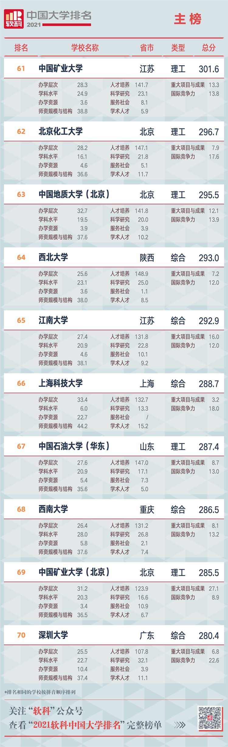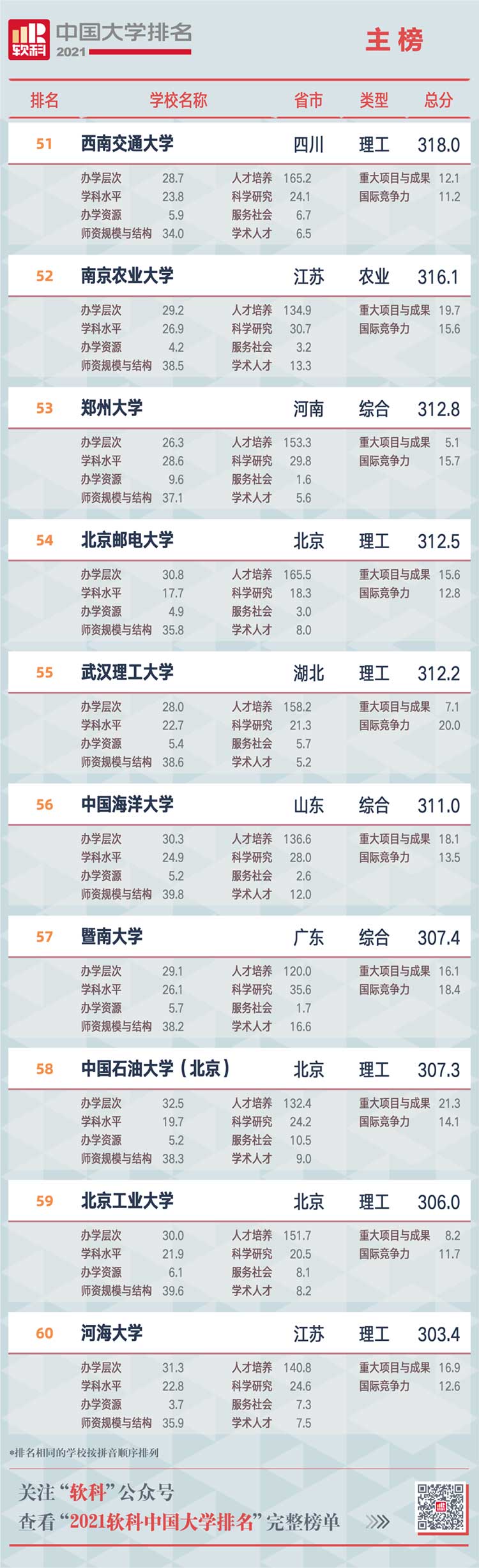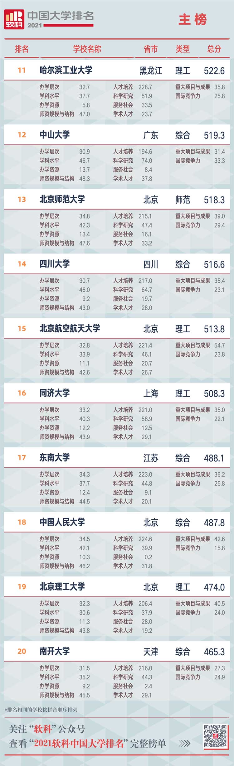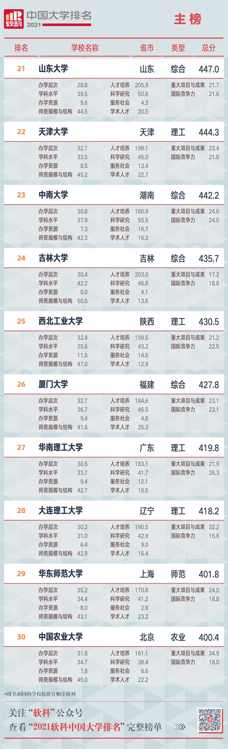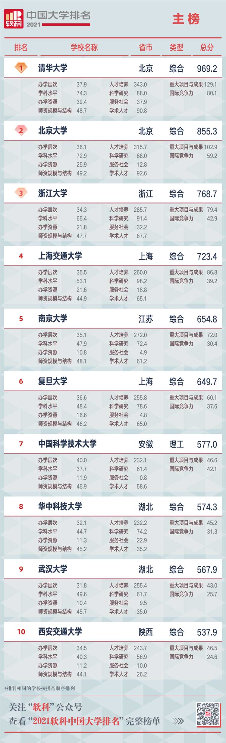 2021年4月26日,高等教育評價專業(yè)機(jī)構(gòu)軟科正式發(fā)布“2021軟科中國大學(xué)排名”。本次共有582所高校上榜2021軟科中國大學(xué)排名(主榜),清華大學(xué)、北京大學(xué)、浙江大學(xué)占據(jù)前三,上海交通大學(xué)、南京大學(xué)位列全國前五。其他位列全國前十名的大學(xué)依次為復(fù)旦大學(xué)(第六)、中國科學(xué)技術(shù)大學(xué)(第七)、華中科技大學(xué)(第八)、武漢大學(xué)(第九)、西安交通大學(xué)(第十)。西安交通大學(xué)相較2020年排名上升1名,首次入圍全國十強(qiáng)。