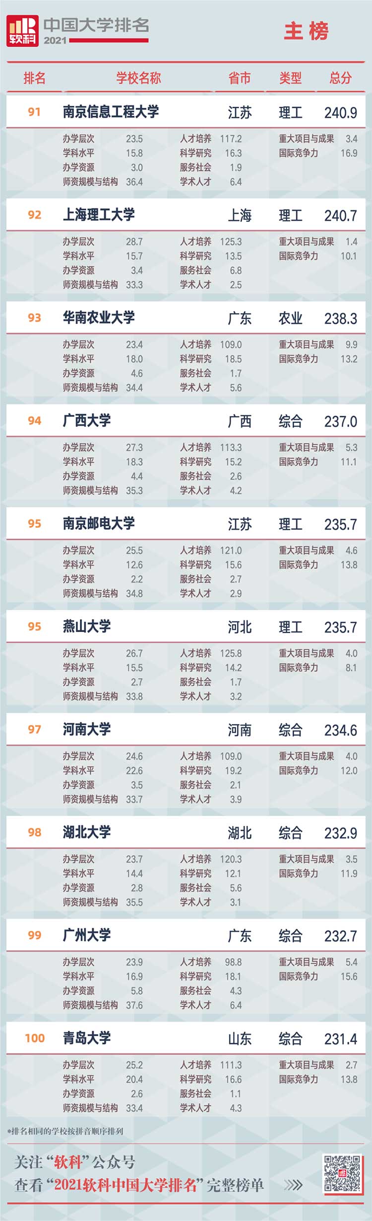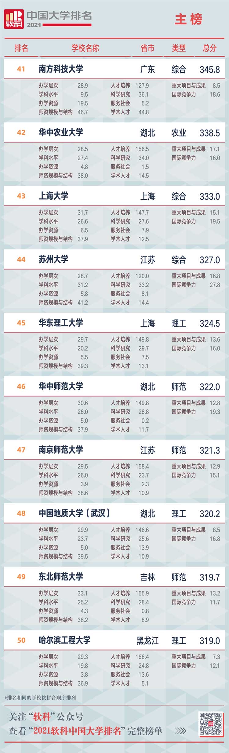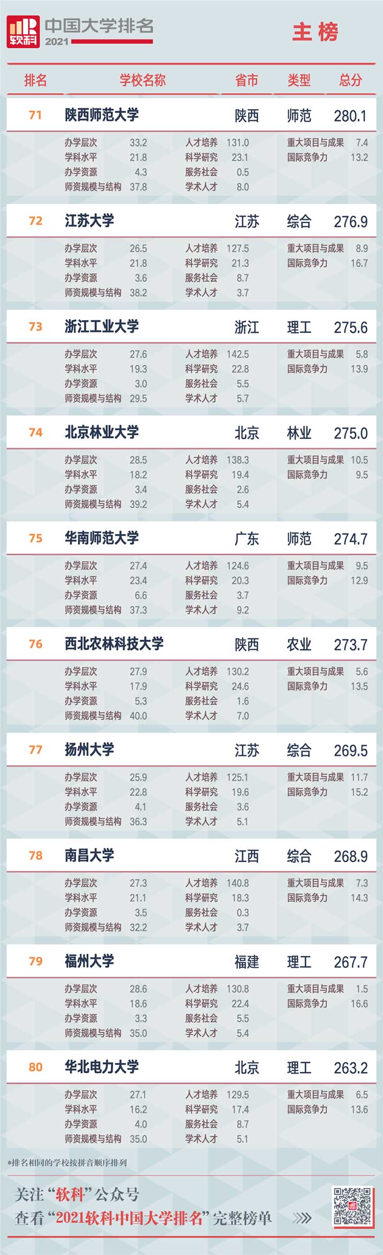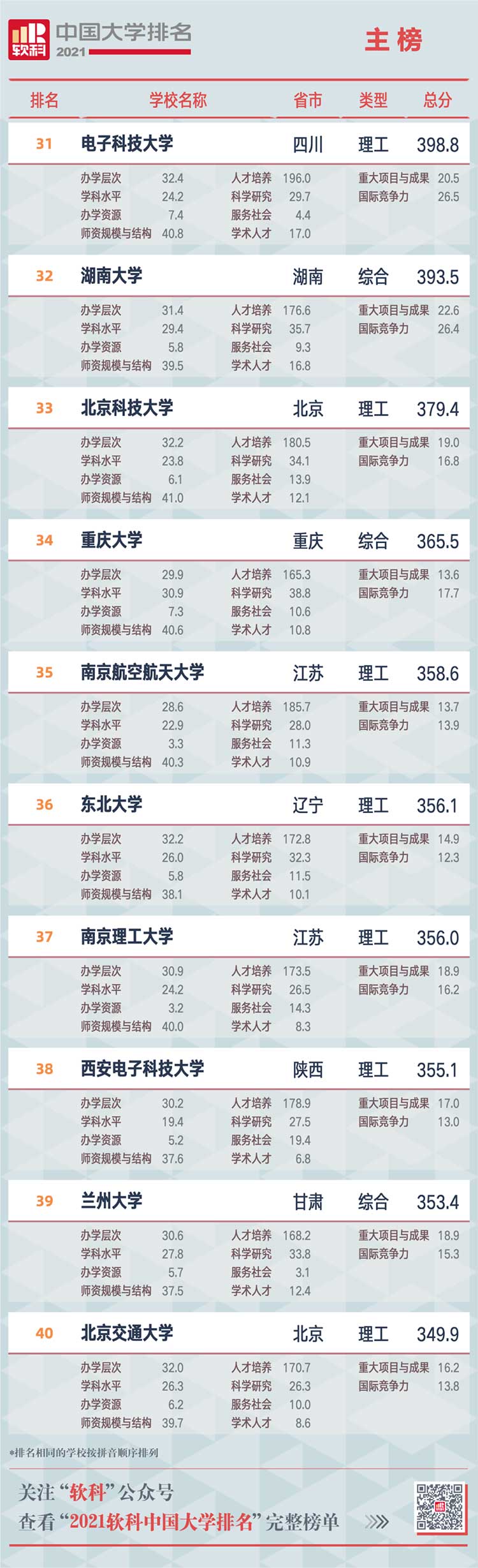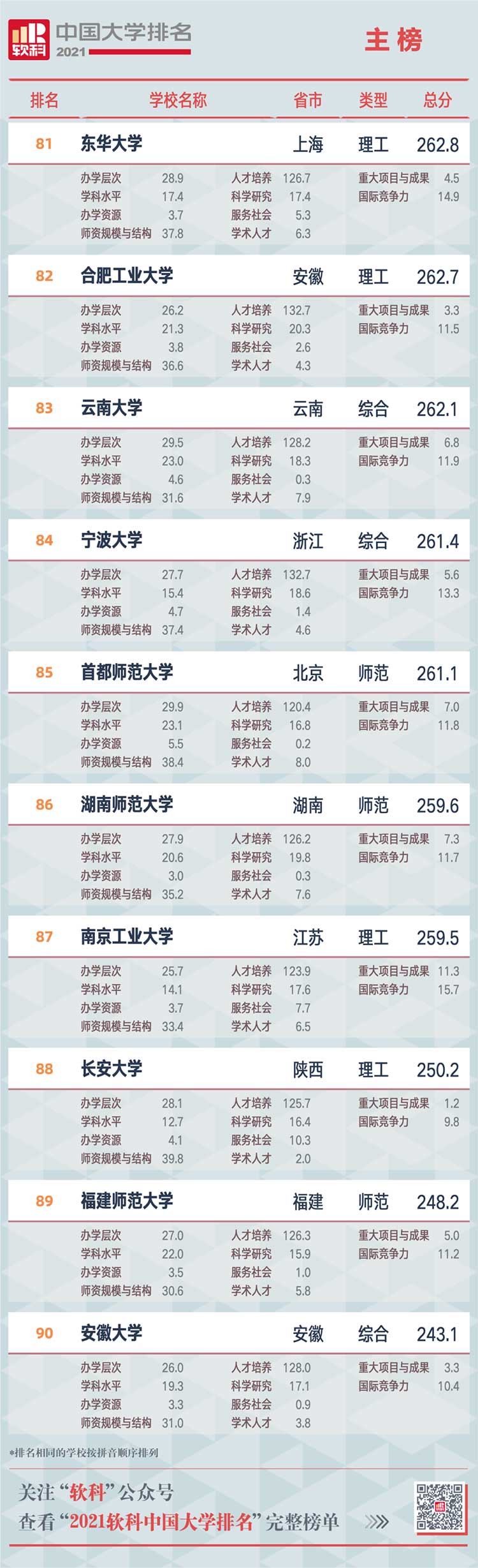 2021年4月26日,高等教育評價專業(yè)機(jī)構(gòu)軟科正式發(fā)布“2021軟科中國大學(xué)排名”。本次共有582所高校上榜2021軟科中國大學(xué)排名(主榜),清華大學(xué)、北京大學(xué)、浙江大學(xué)占據(jù)前三,上海交通大學(xué)、南京大學(xué)位列全國前五。其他位列全國前十名的大學(xué)依次為復(fù)旦大學(xué)(第六)、中國科學(xué)技術(shù)大學(xué)(第七)、華中科技大學(xué)(第八)、武漢大學(xué)(第九)、西安交通大學(xué)(第十)。西安交通大學(xué)相較2020年排名上升1名,首次入圍全國十強(qiáng)。