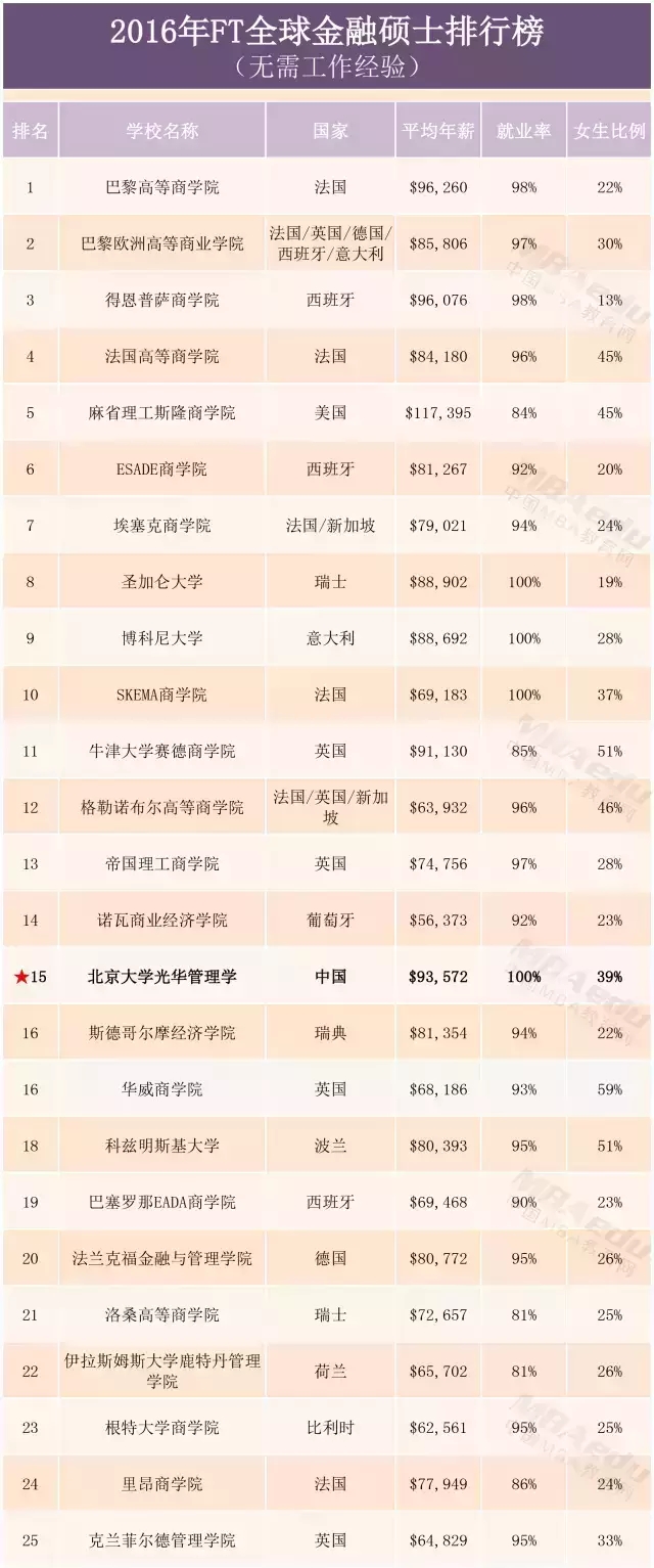 這是金融時報發(fā)布的第六版金融碩士排名,同時給出了無工作經驗專業(yè)排名(pre-experience programmes)和有工作經驗專業(yè)排名(post-experience programmse)。此處,前者針對沒有或有很少的相關專業(yè)工作經驗,而后者的項目則要求學生注冊前有相關工作經驗。需要說明的是,金融工程專業(yè)不在此項排名中,因此更關注學生的數(shù)量分析能力。