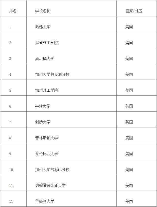 USNews2017年世界大學(xué)排行榜中,哈佛大學(xué)、麻省理工學(xué)院和斯坦福大學(xué)位居前三,排名第四到第十的高校是加州大學(xué)伯克利分校、加州理工學(xué)院、牛津大學(xué)、劍橋大學(xué)、普林斯頓大學(xué)、哥倫比亞大學(xué)和加州大學(xué)洛杉磯分校。前十高校共有美國高校8所,英國高校2所。