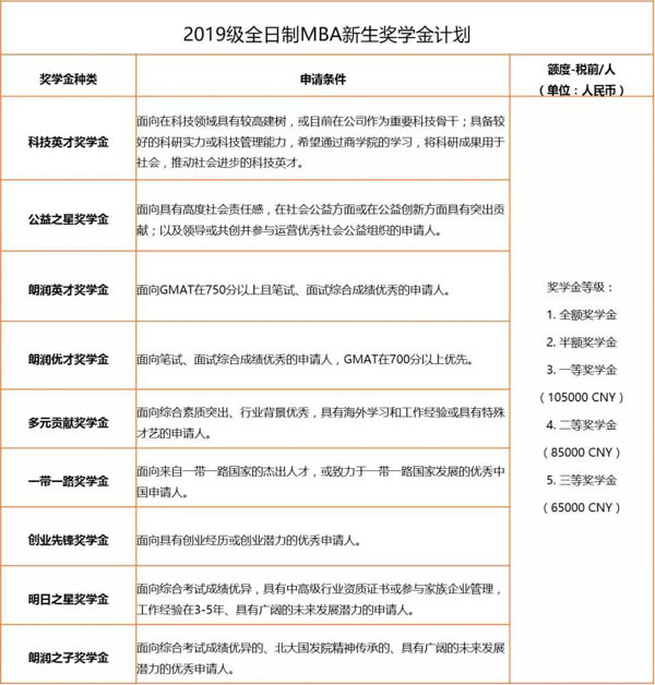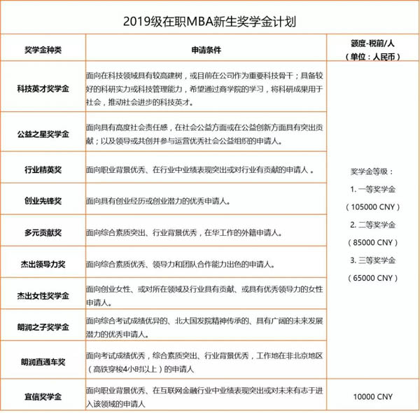 注:更多細(xì)節(jié),請(qǐng)登陸官網(wǎng)www.bimba.pku.edu.cn了解。北大國發(fā)院MBA項(xiàng)目獎(jiǎng)學(xué)金解釋權(quán)歸學(xué)院所有,在不做通知情況下,北大國發(fā)院有權(quán)對(duì)獎(jiǎng)學(xué)金做任何更改與調(diào)整。
