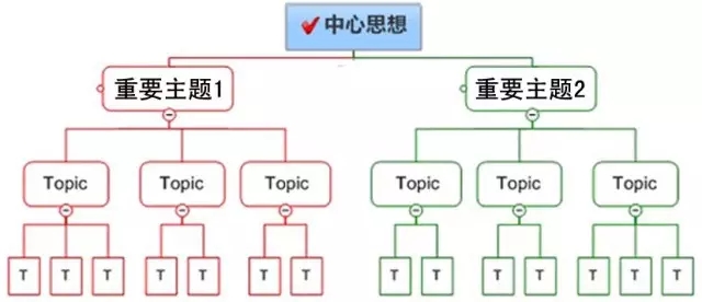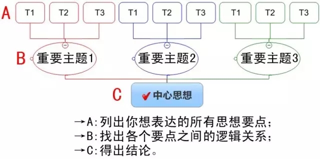 金字塔頂端是中心思想,第二層是重要主題,第三層是次重要主題,第四層是小點或論據(jù)。