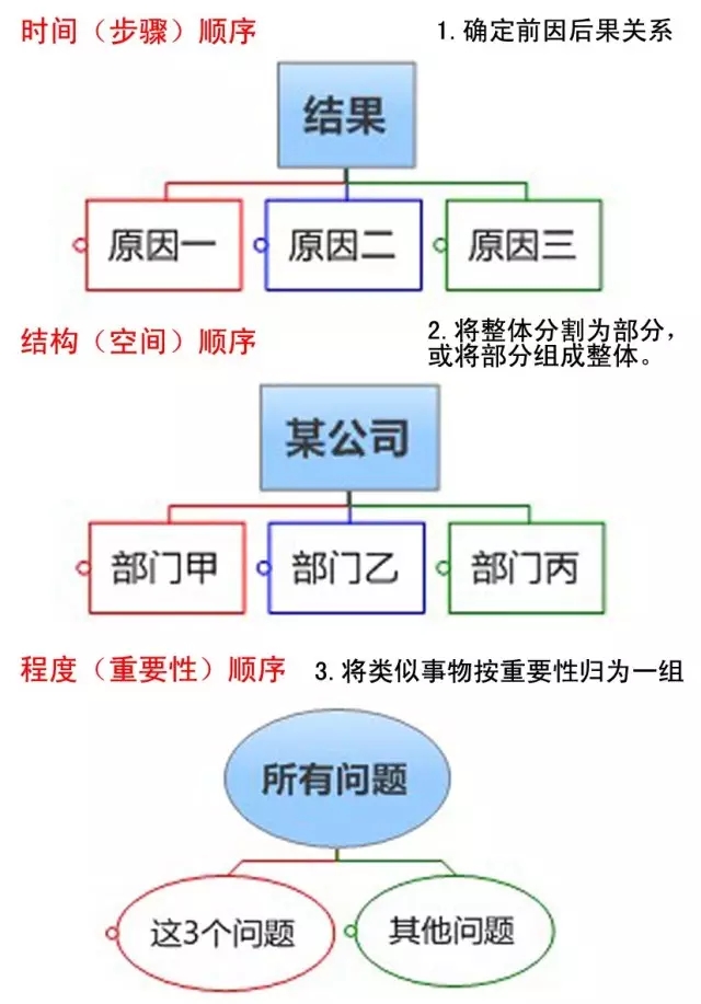 在演繹性的思想中,你可以毫不費力地找出該組思想的邏輯順序:即演繹推理的順序。但在歸納性的思想組中,為了清晰地將你的想法表達(dá)給讀者,你必須選擇一種邏輯順序。大腦的歸納分組分析活動只有以下3組邏輯順序:時間順序(步驟)、結(jié)構(gòu)順序(空間)、程度順序(重要性),如下圖所示: