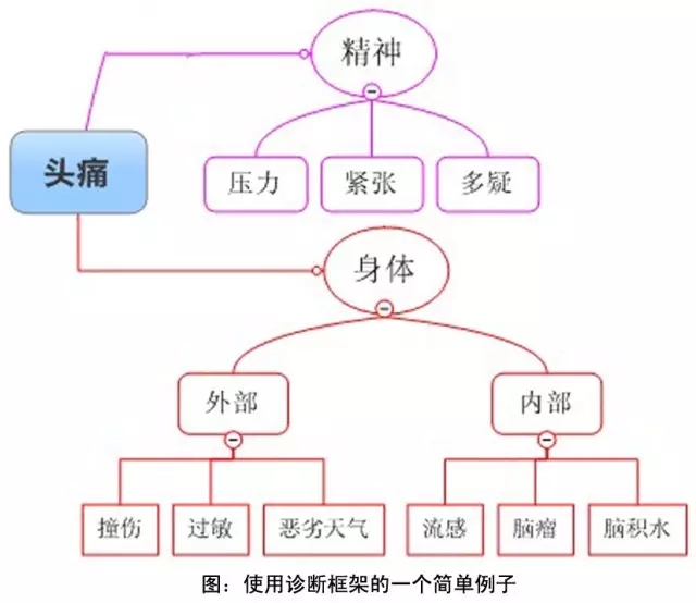 使用診斷框架可以幫助你更清楚地知道問題產(chǎn)生的根源在哪里。這種設(shè)想最終會揭示出你的分析該關(guān)注的要素或活動(dòng)。舉個(gè)很簡單的例子,如果你頭痛但是不知道原因,你可以這么使用診斷框架:先從身體因素和精神因素考慮,在從內(nèi)外部細(xì)分。