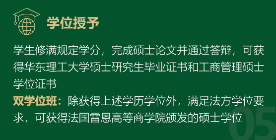 華東理工大學(xué)的MBA項目為學(xué)生提供了專業(yè)核心課、公共課、中文班的多個選修模塊,以及針對特定產(chǎn)業(yè)的生物醫(yī)藥專業(yè)班、大健康產(chǎn)業(yè)管理班和具備專業(yè)偏重的國際合作的特別班型。學(xué)生需要完成45個學(xué)分,通過畢業(yè)論文和答辯,以獲得工商管理碩士學(xué)位和研究生畢業(yè)證書。對于雙學(xué)位班級,學(xué)生還需滿足法方學(xué)位要求,以獲得法方學(xué)校頒發(fā)的碩士學(xué)位證書。
